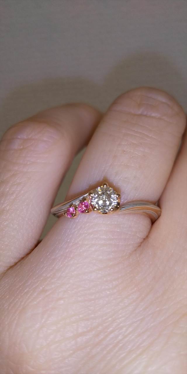 普段、仕事をしているときには整体師という仕事柄、指輪はしていませんが、外出する時にはめて行きます。特に夫とお出掛けする時には結婚指輪と婚約指輪の重ね付けをして出掛けていて、桜ダイヤモンドのついた婚約指輪をつけるとテンションが上がります。重ね付け出来るデザインにしてもらえて本当に良かったと思っています。ただ、私の指輪の内側は肌へのあたりが柔らかい素材で、それが少し変色しやすく、コロナでアルコール消毒を頻発に使用していた時はクリーニングをこまめにしないといけなかったのはちょっと面倒でした。